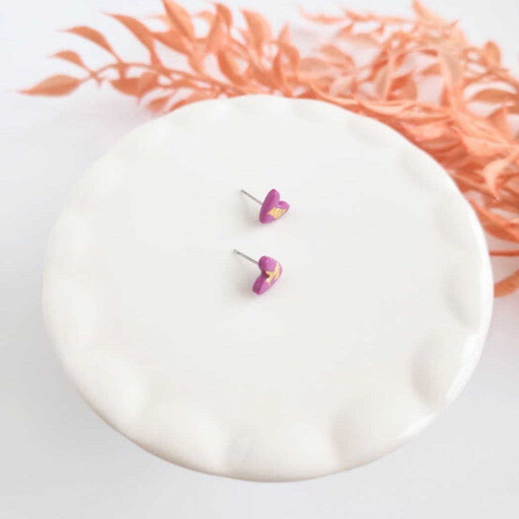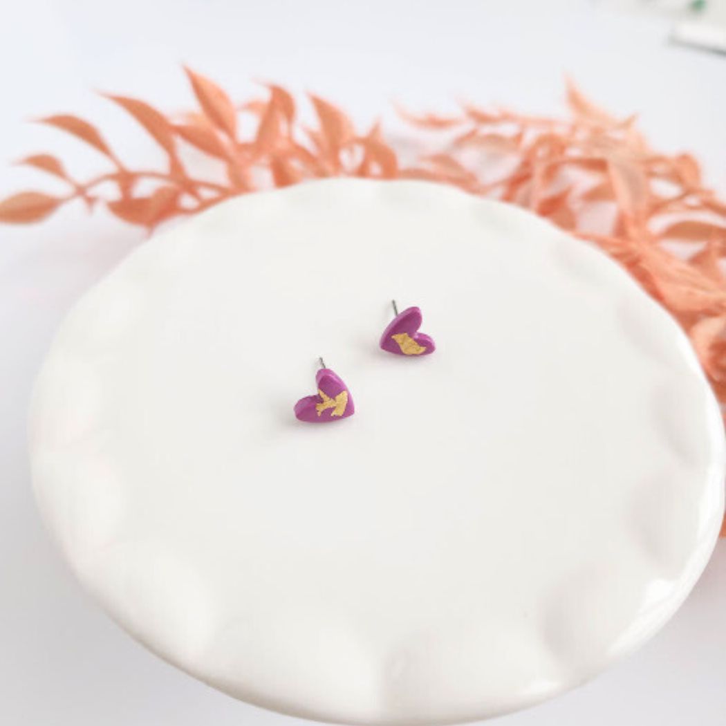 These heart shaped stud earrings are a lightweight, handmade earring made of polymer clay mixed with imitation gold flakes. These earrings are small and minimal, but anything but plain. The stainless steel earring posts are attached with resin at the base of the posts for a super strong hold.