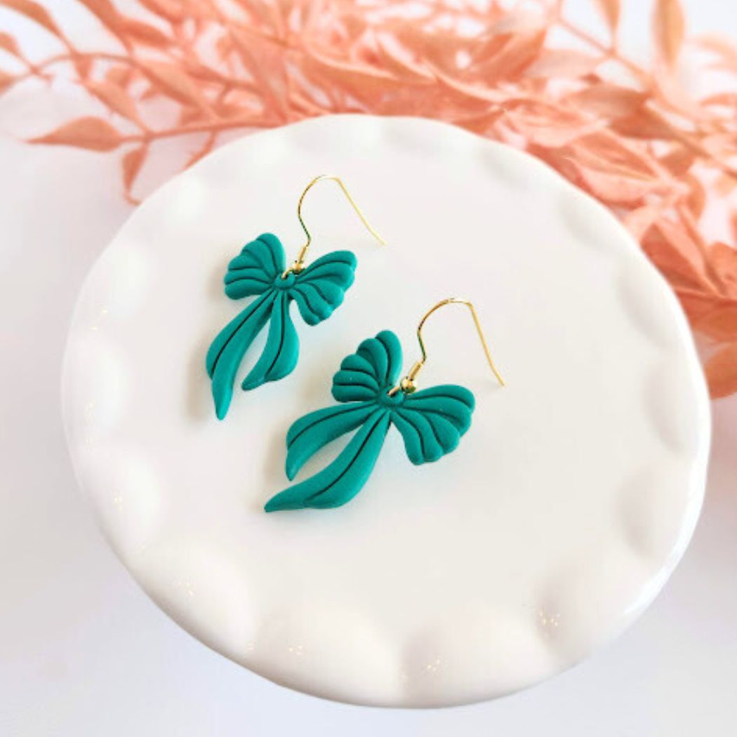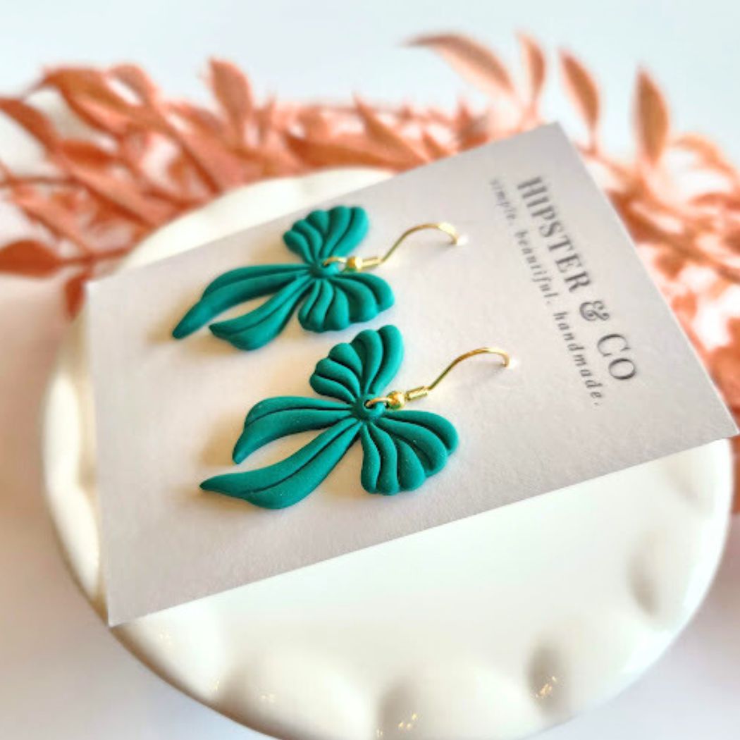 These green bow dangle earrings are super lightweight and a great statement accessory. These earrings are handmade out of black polymer clay in small batches.