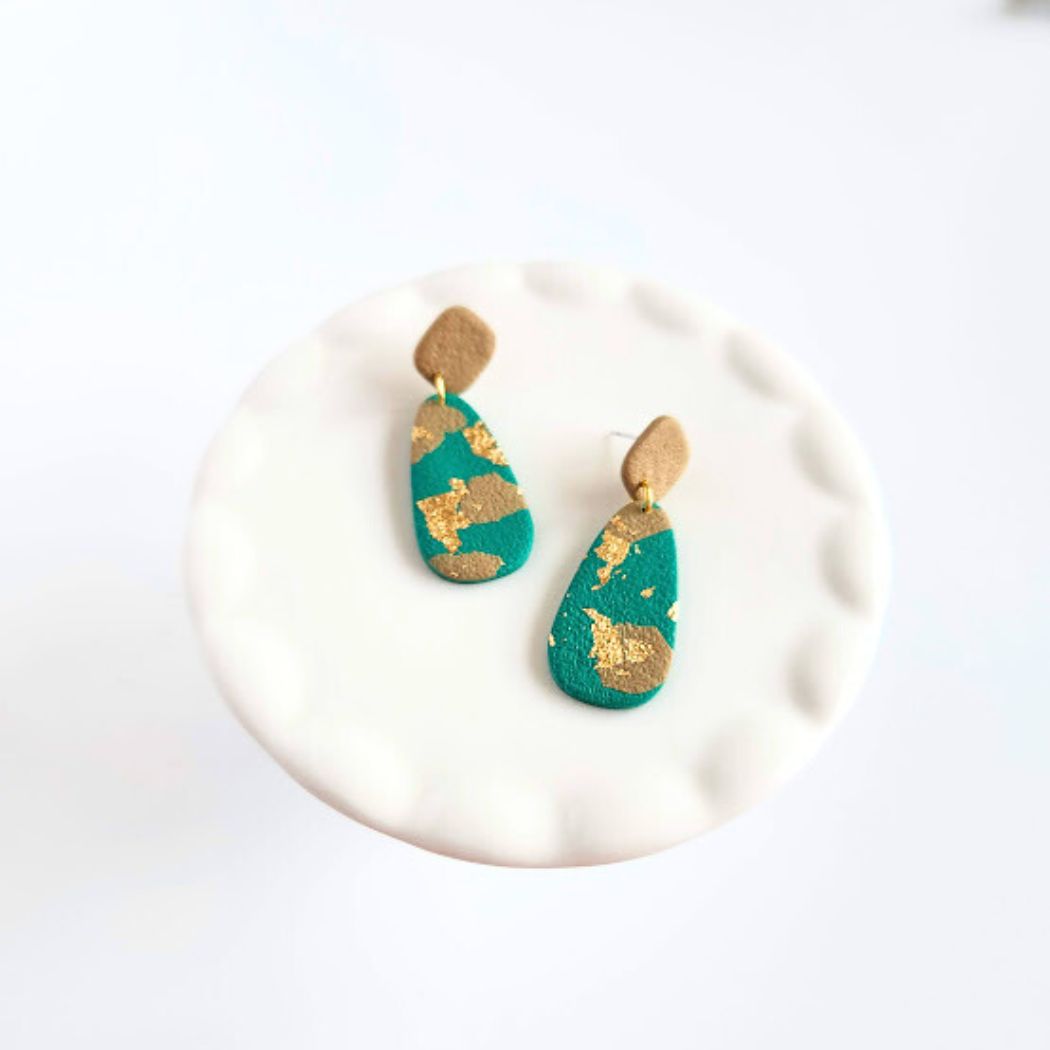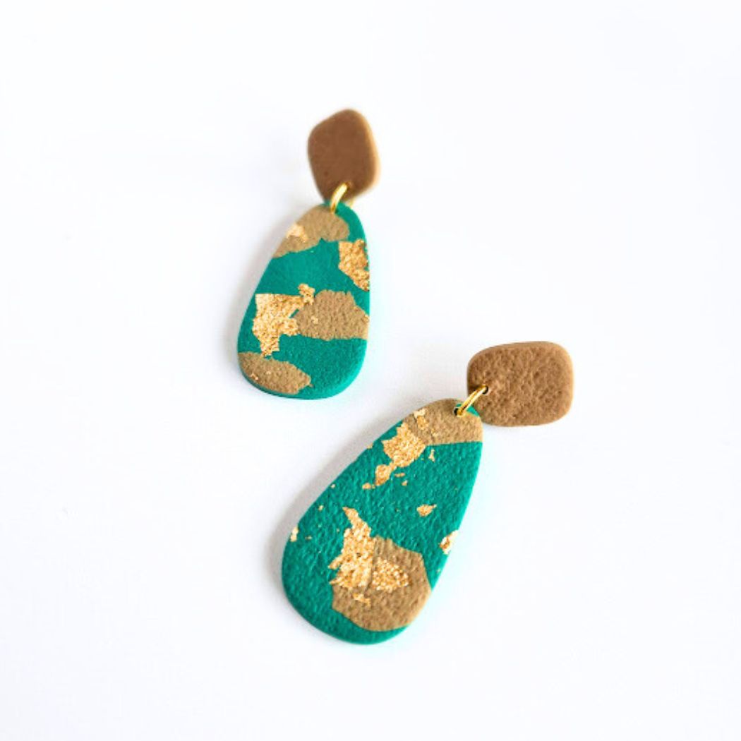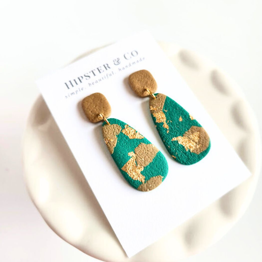 Green, Brown, and Gold Dangle Polymer Clay Earrings