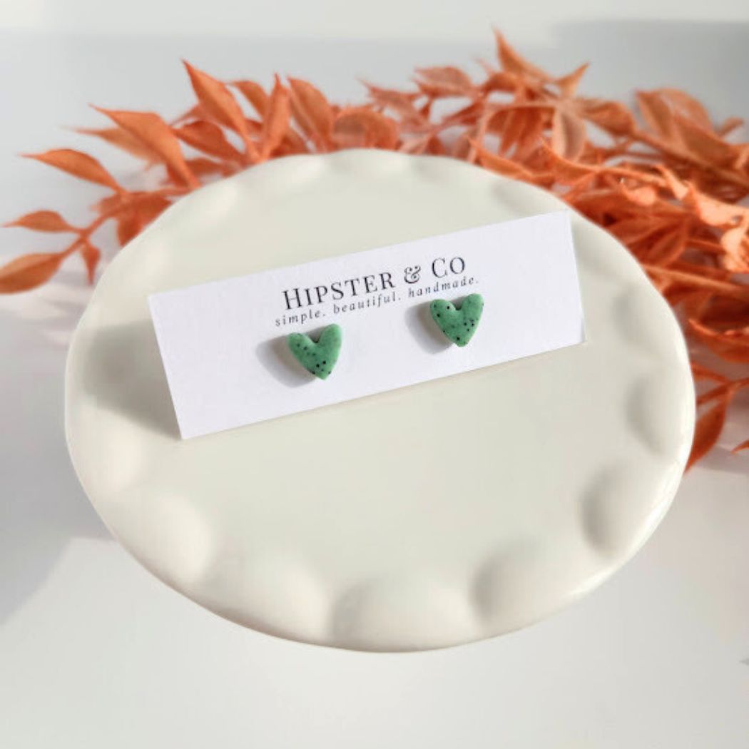 These heart shaped stud earrings are a lightweight, handmade earring made of polymer clay mixed with imitation gold flakes. These earrings are small and minimal, but anything but plain. The stainless steel earring posts are attached with resin at the base of the posts for a super strong hold.
