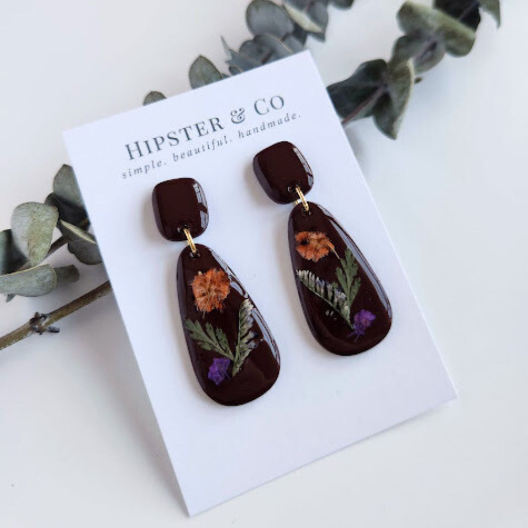 Chocolate Brown Teardrop Floral Polymer Clay Earrings