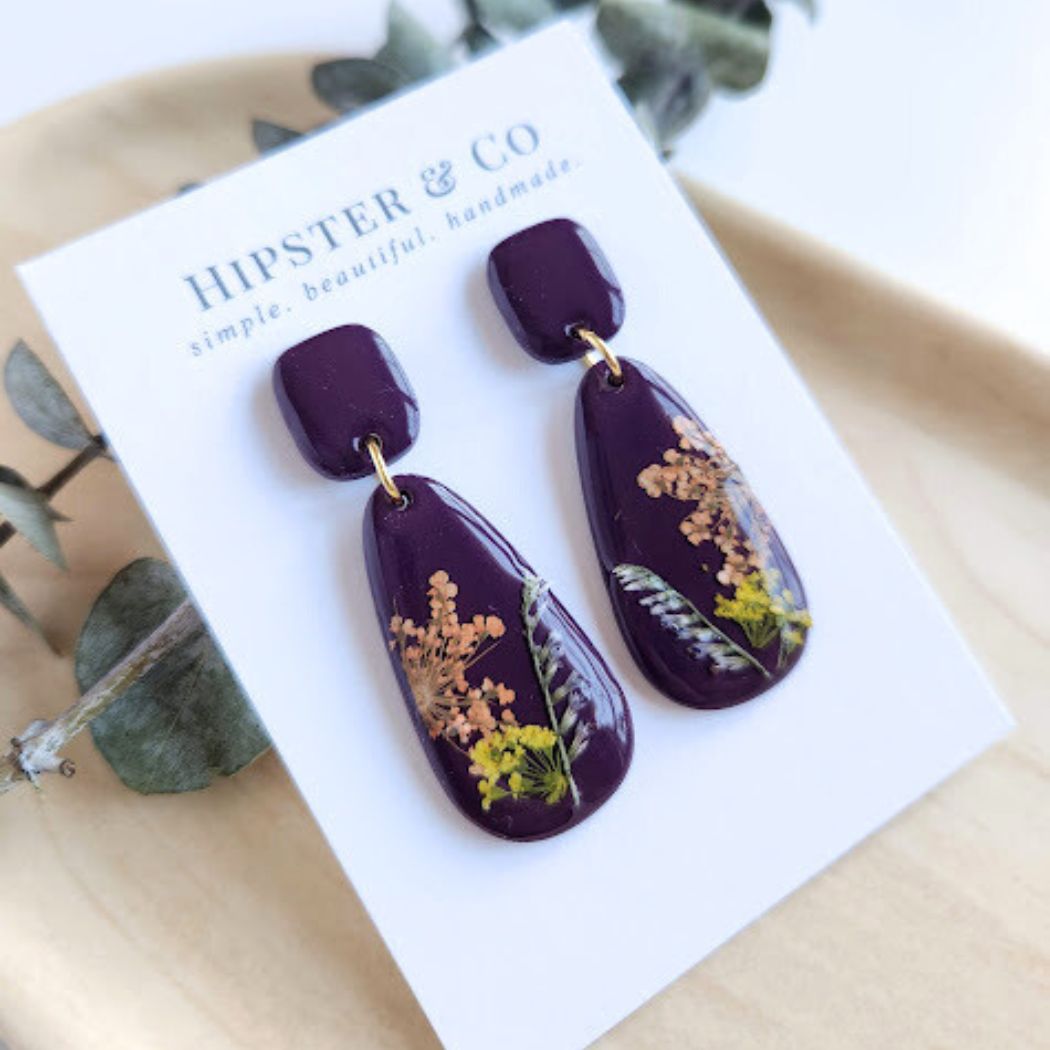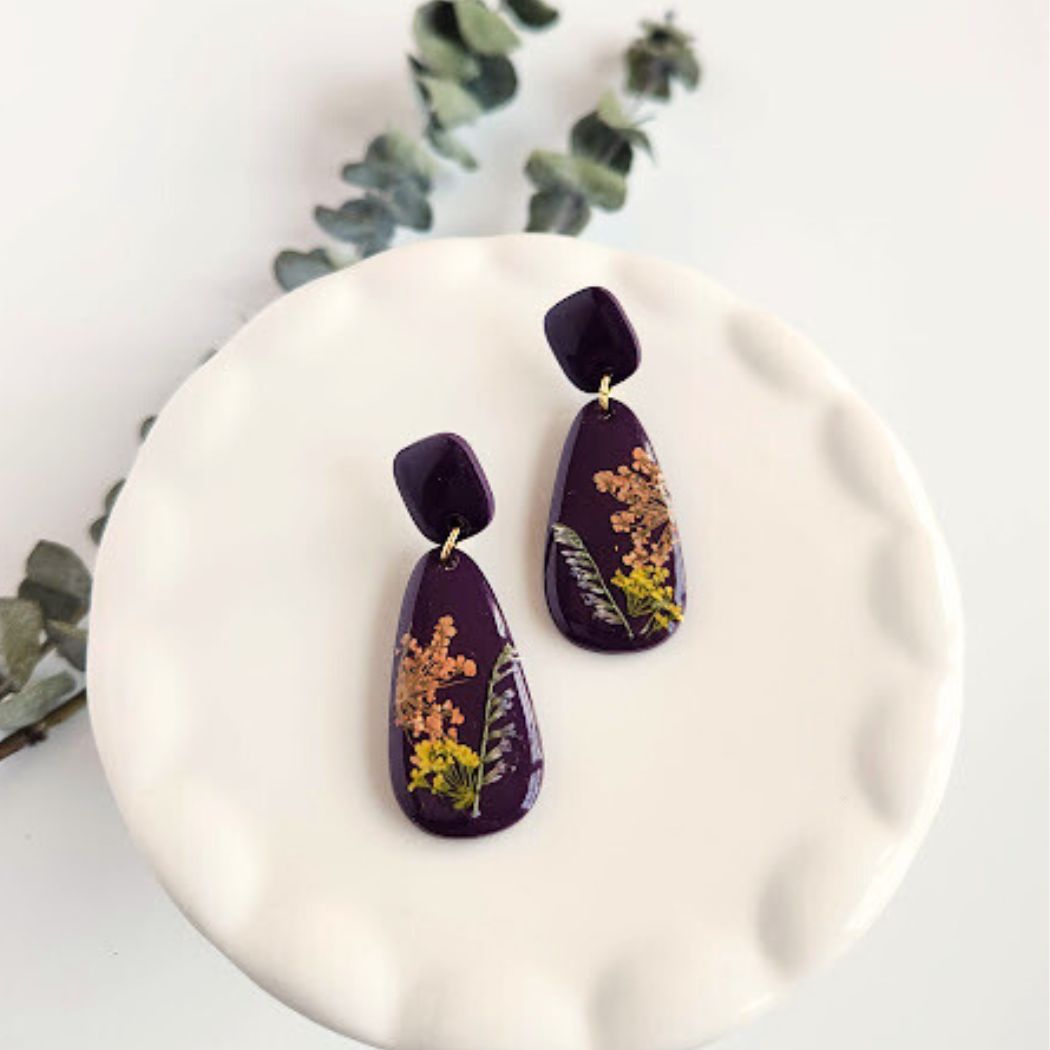 Eggplant Purple Teardrop Floral Polymer Clay Earrings