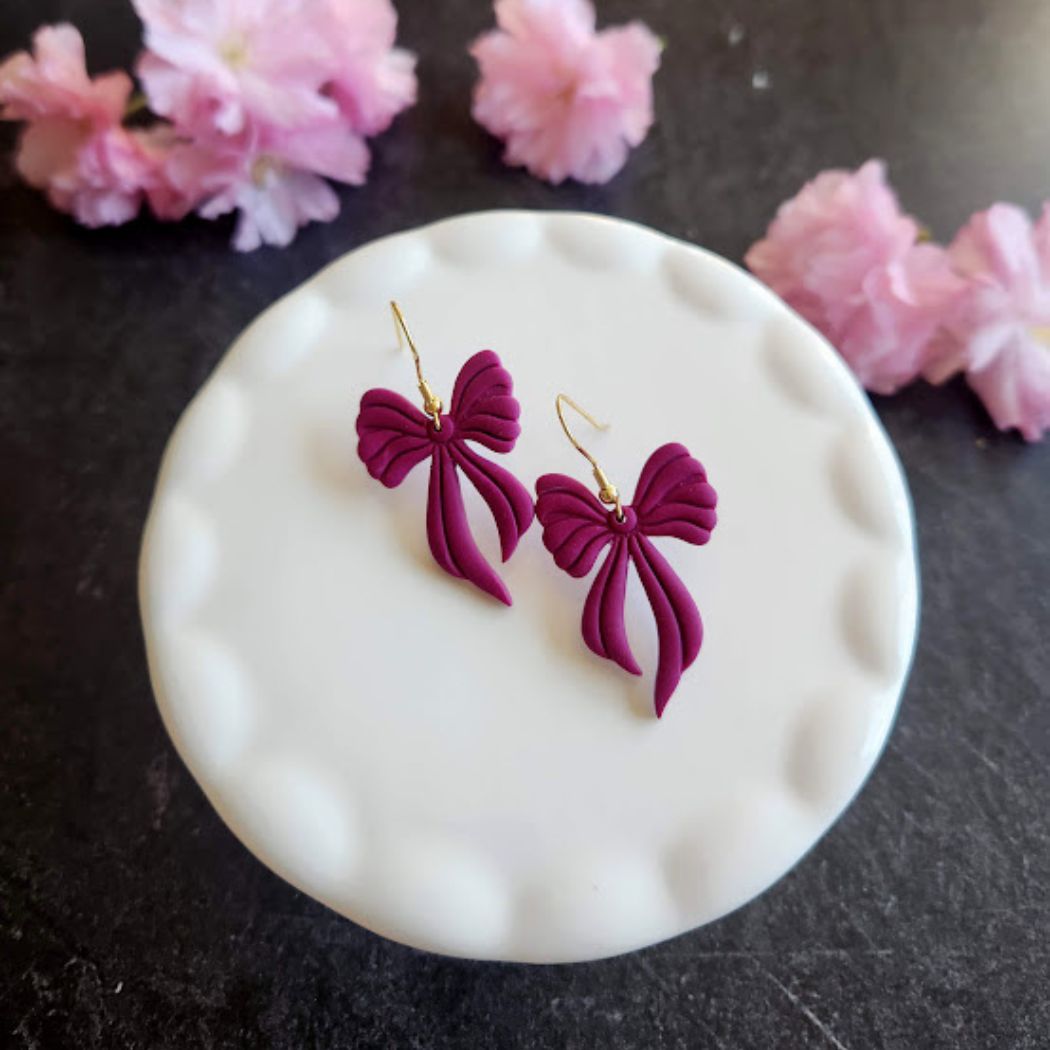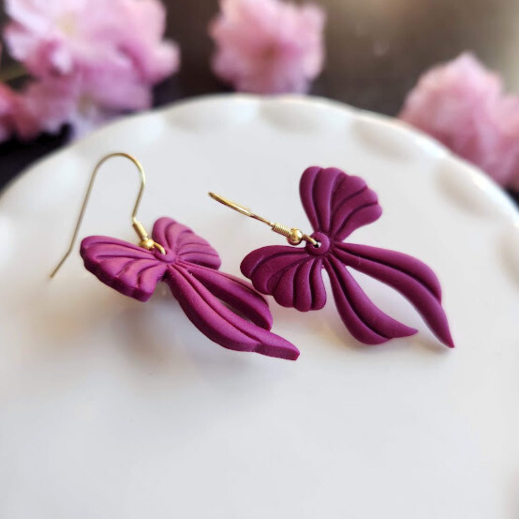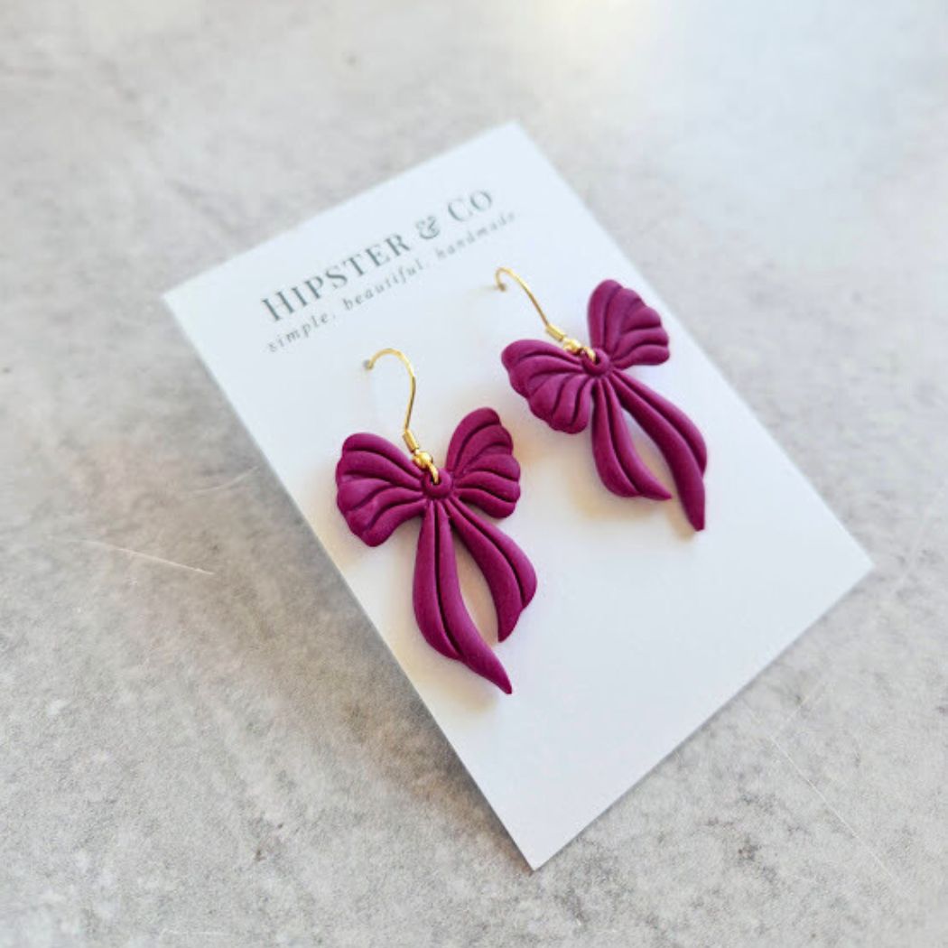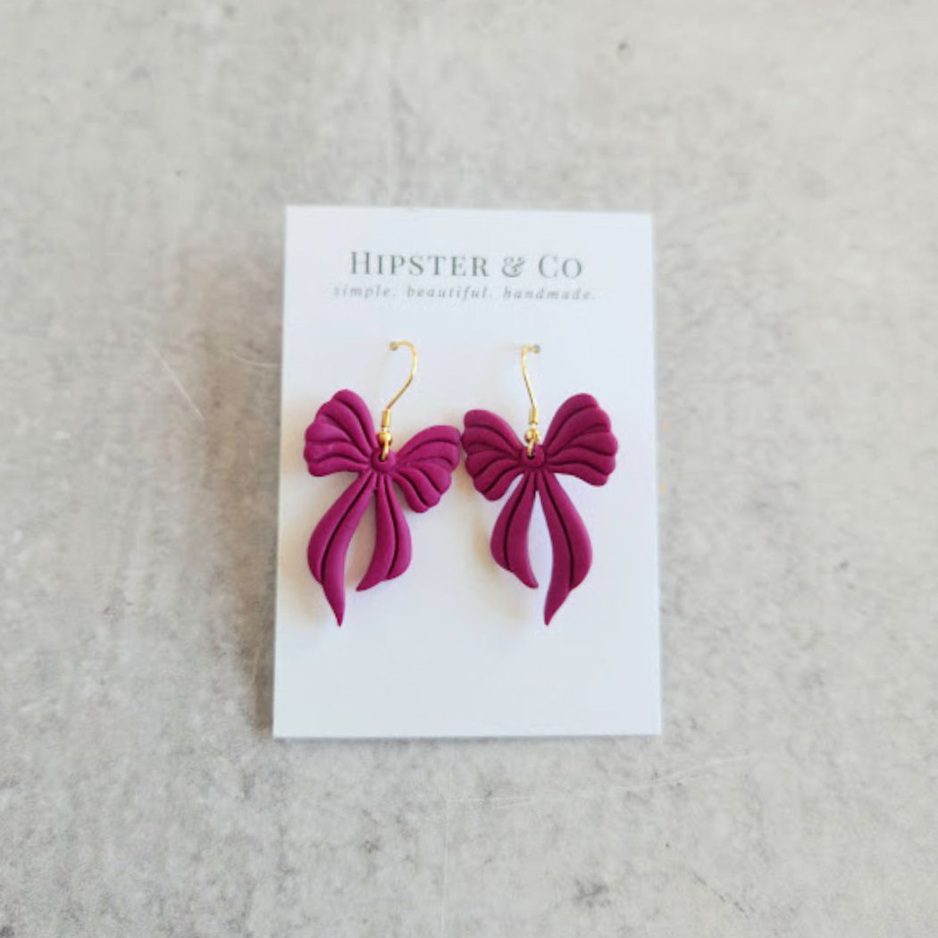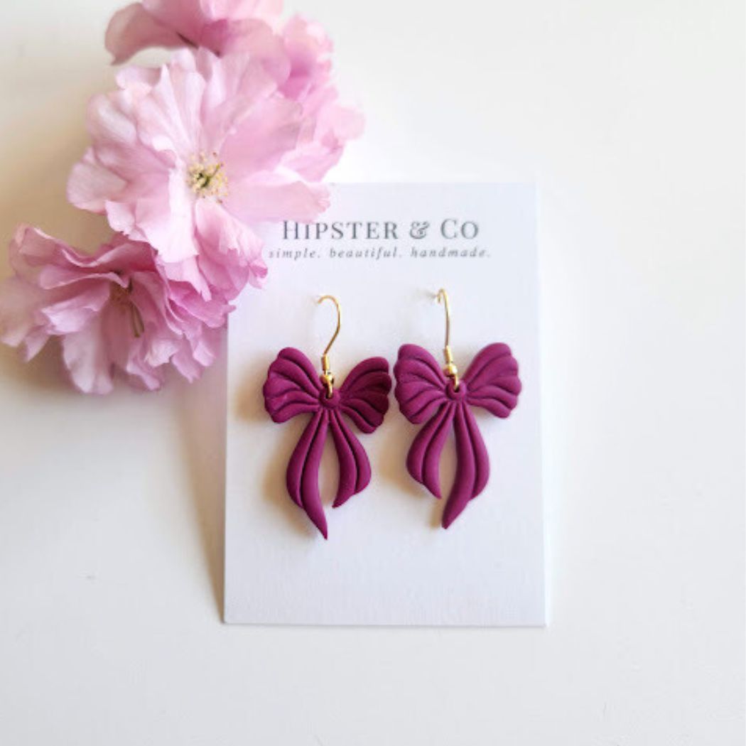 These raspberry colored bow dangle earrings are super lightweight and a great statement accessory. These earrings are handmade out of a purple polymer clay in small batches.