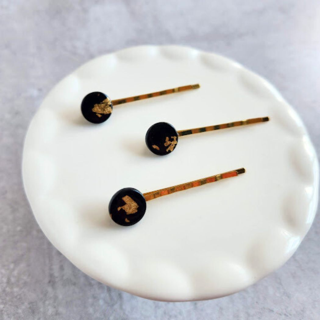 Hair pins are a great way to clip your hair back. Not only are they functional, but they are also decorative hair accessories. These hair pins come in a pack of 3 handmade pins. The circular disks are handmade out of polymer clay and attached to gold colored bobby pins.