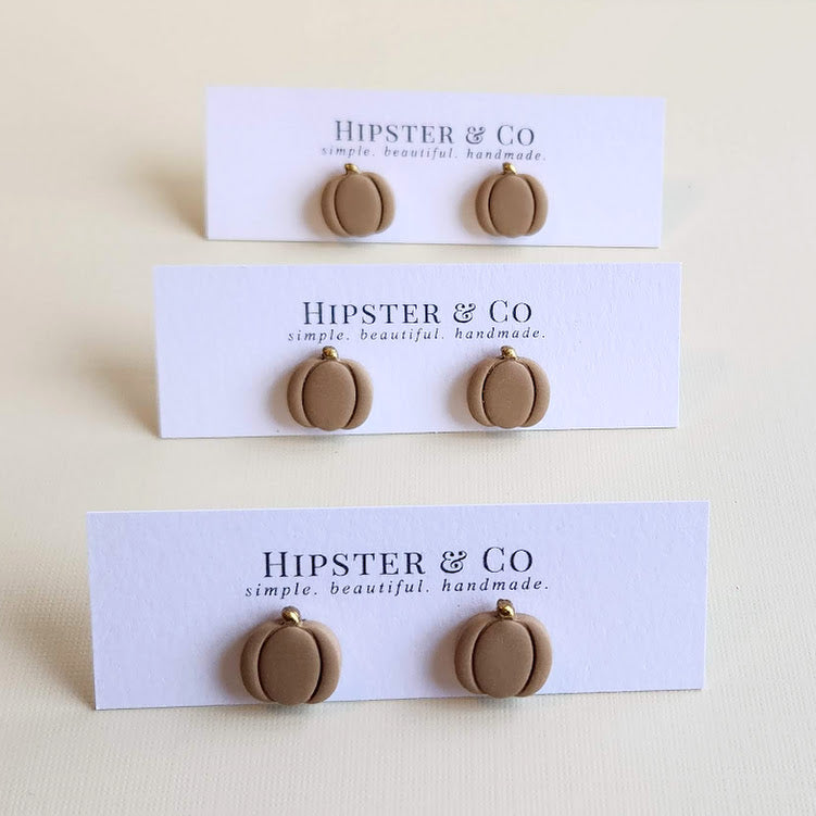 The Brown Pumpkin stud earrings are a lightweight, handmade earring made of polymer clay and painted with a gold leaf paint on its stem. These earrings are small and minimal, but anything but plain. They have a matte finish. The stainless steel earring posts are glued on and coated with resin at the base of the posts for a super strong hold.