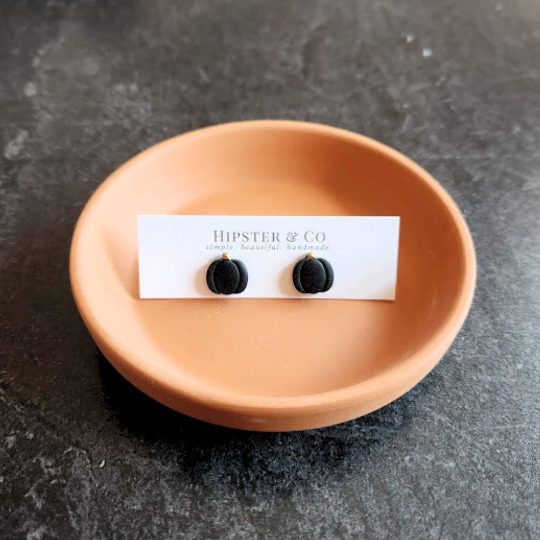 The Black Pumpkin stud earrings are a lightweight, handmade earring made of polymer clay and painted with a gold leaf paint on its stem. These earrings are small and minimal, but anything but plain. They have a matte finish. The stainless steel earring posts are glued on and coated with resin at the base of the posts for a super strong hold.