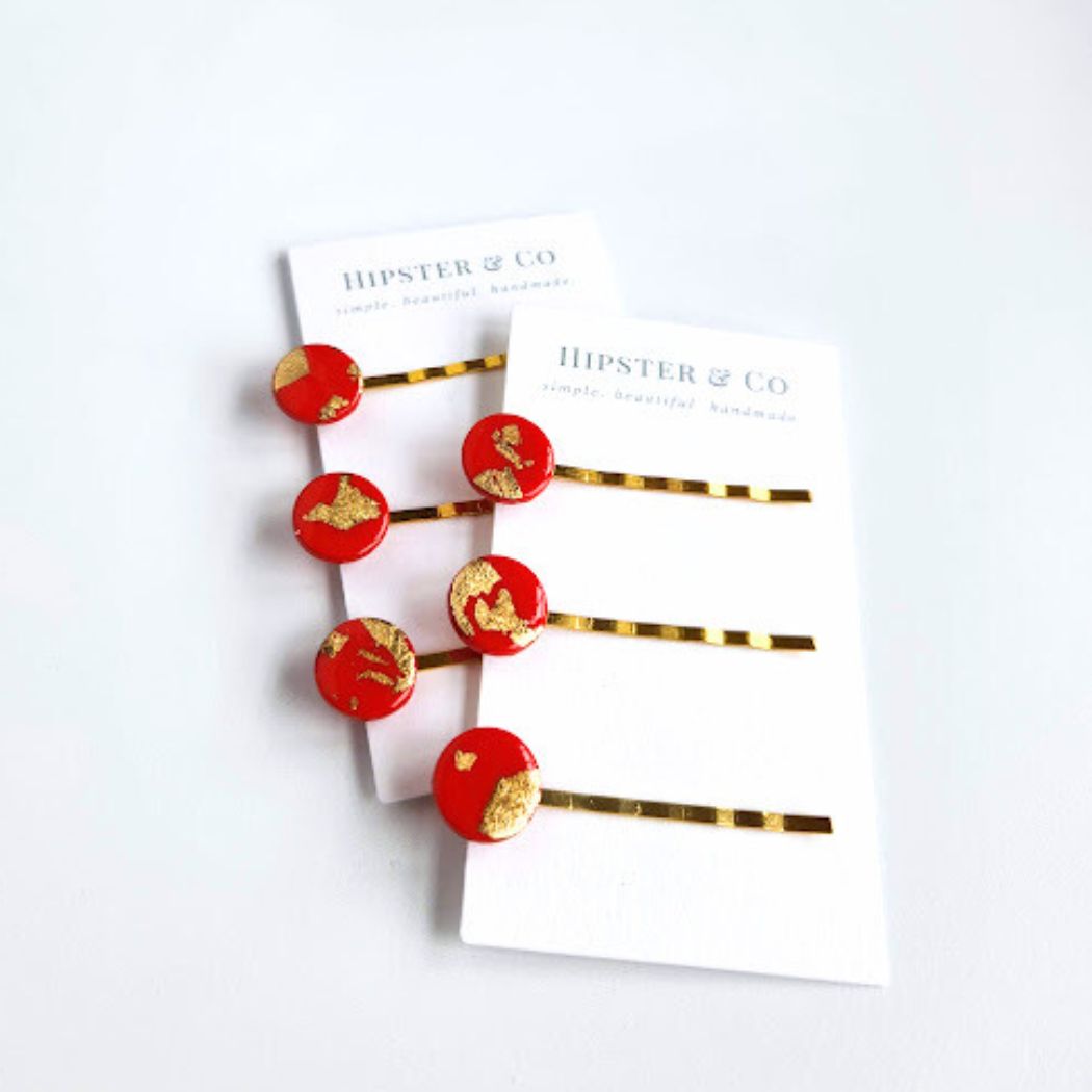 Hair pins are a great way to clip your hair back. Not only are they functional, but they are also decorative hair accessories. These hair pins come in a pack of 3 handmade pins. The circular disks are handmade out of polymer clay and attached to gold colored bobby pins.