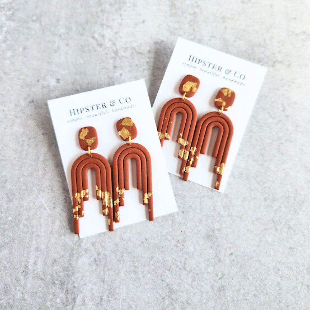 These lightweight earrings make for a fun statement accessory. The Angelica earrings are handmade in small batches with a beautiful terracotta colored polymer clays and imitation gold leaf flakes. The stainless steel earring posts are glued on and coated with resin at the base of the posts for a super strong hold.