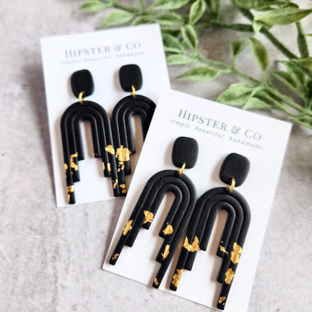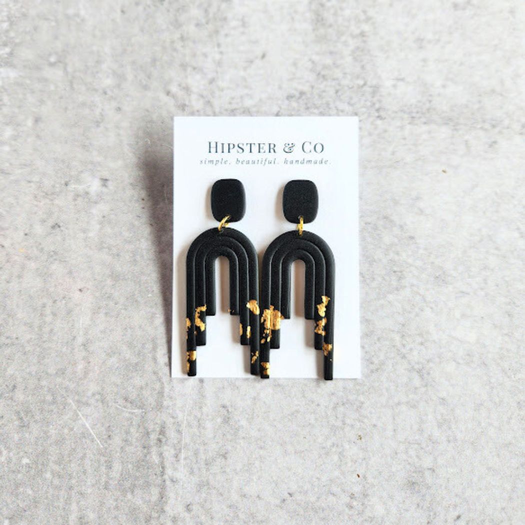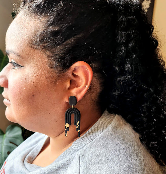 These lightweight earrings make for a fun statement accessory. The Angelica earrings are handmade in small batches with a beautiful black polymer clays and imitation gold leaf flakes. The stainless steel earring posts are glued on and coated with resin at the base of the posts for a super strong hold.
