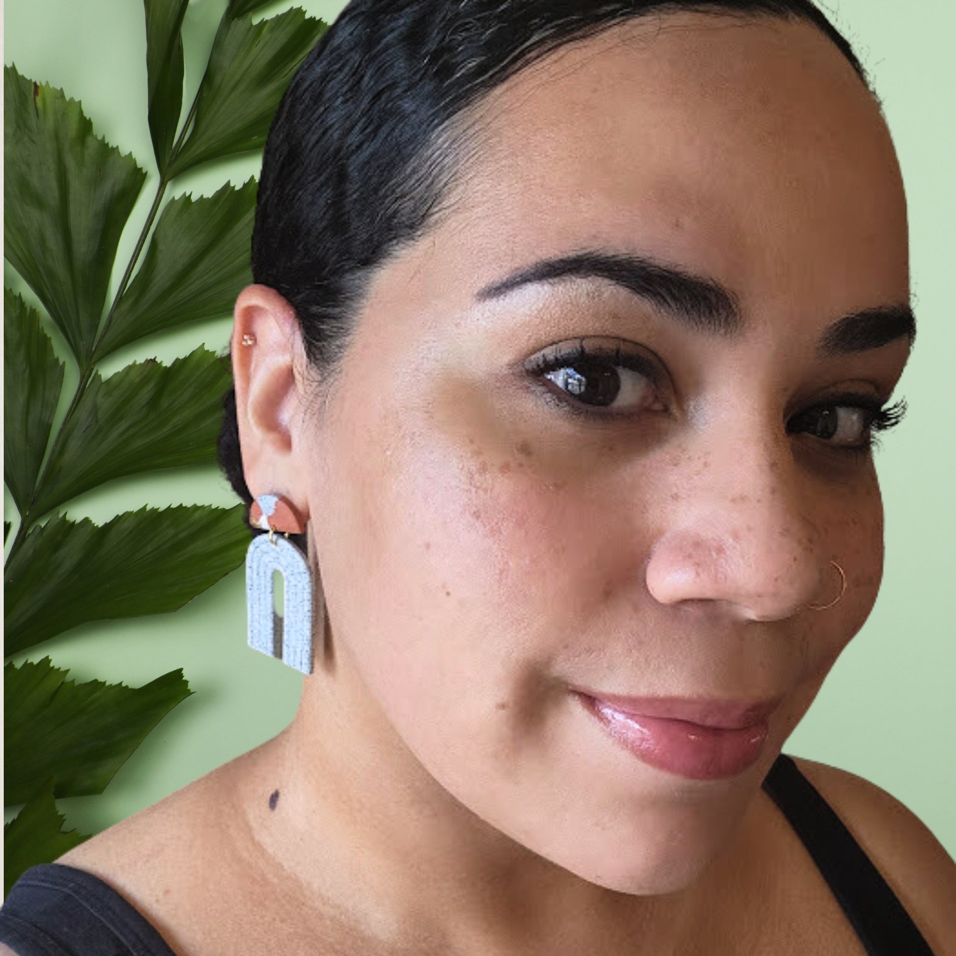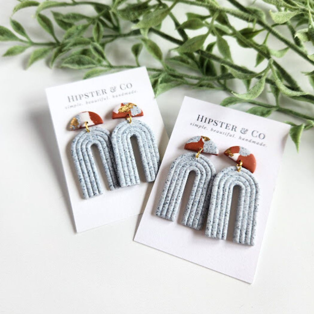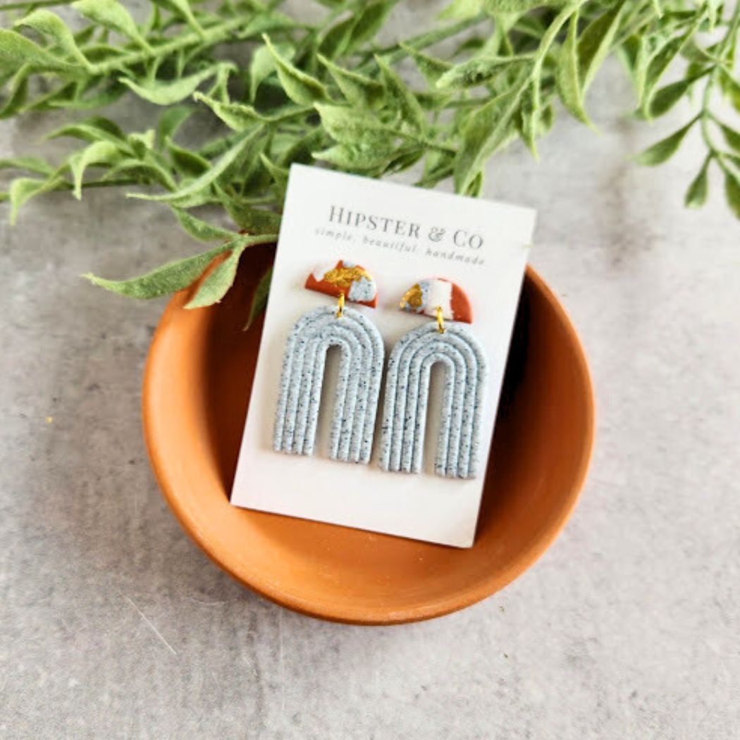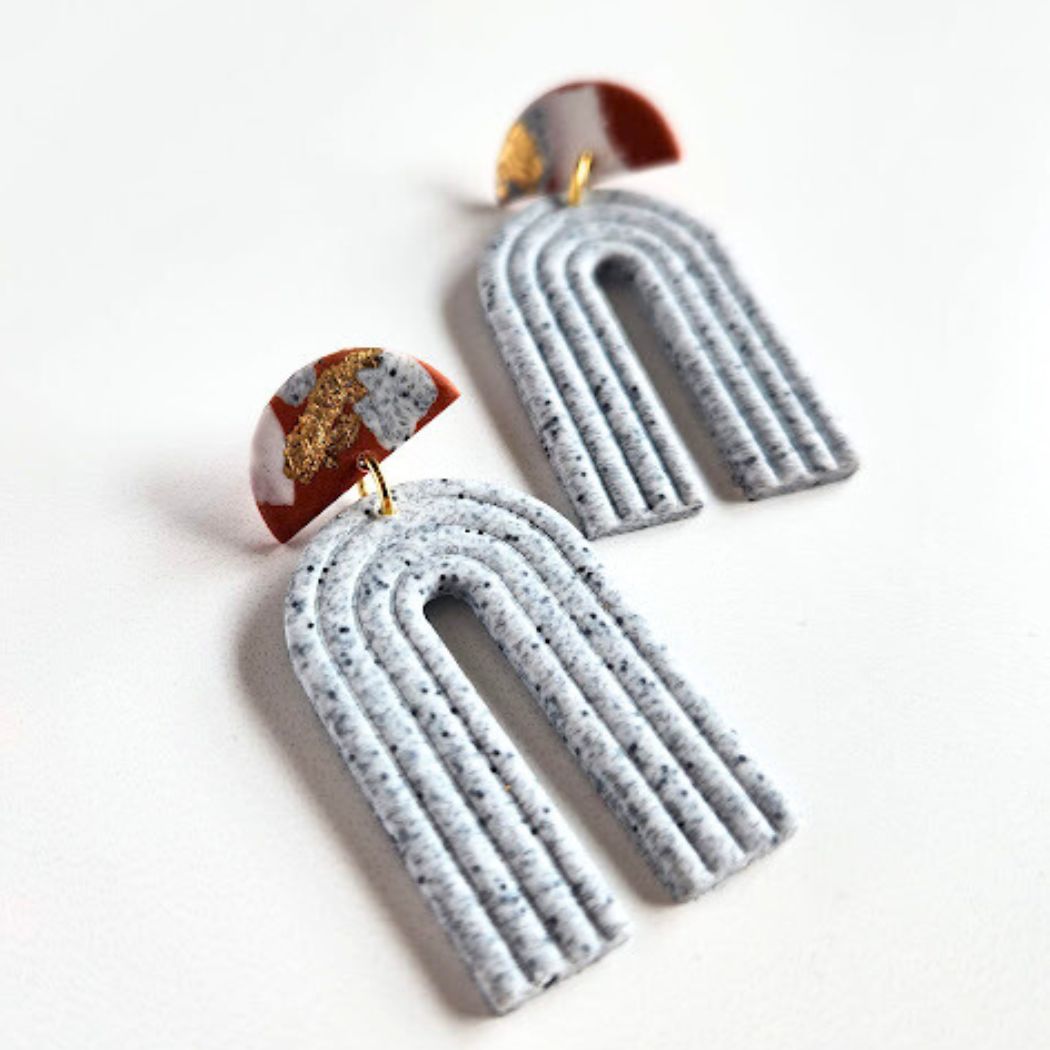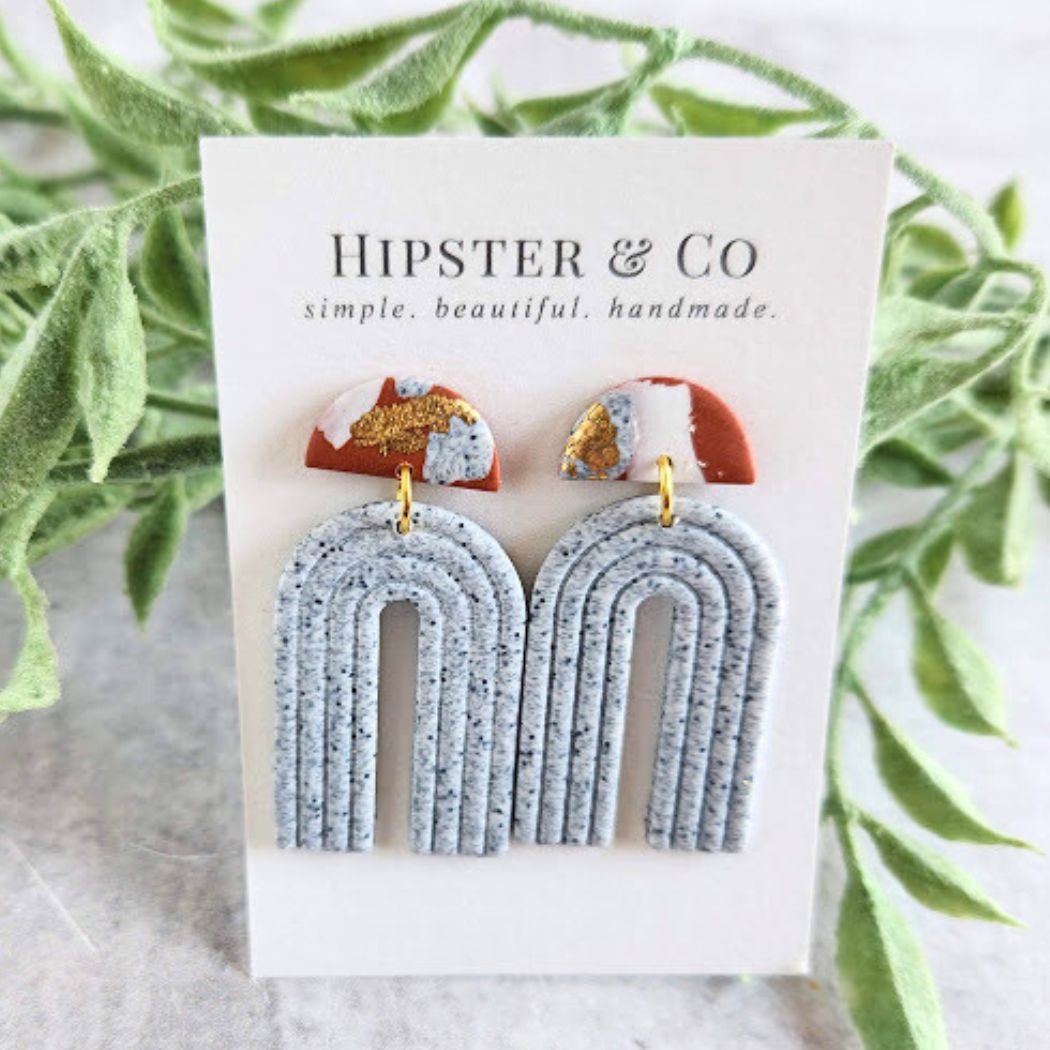 These lightweight earrings make for a fun statement accessory. The Matty earrings are handmade in small batches with a beautiful mix of colors and textures of polymer clays and imitation gold leaf flakes. The stainless steel earring posts are glued on and coated with resin at the base of the posts for a super strong hold.