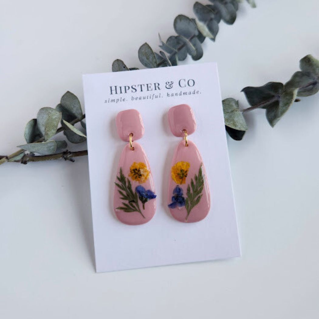 Polymer clay earrings, decorated with dried flowers and coated with a layer of resin. Because of the nature of these earrings, only one of each floral design will be available.