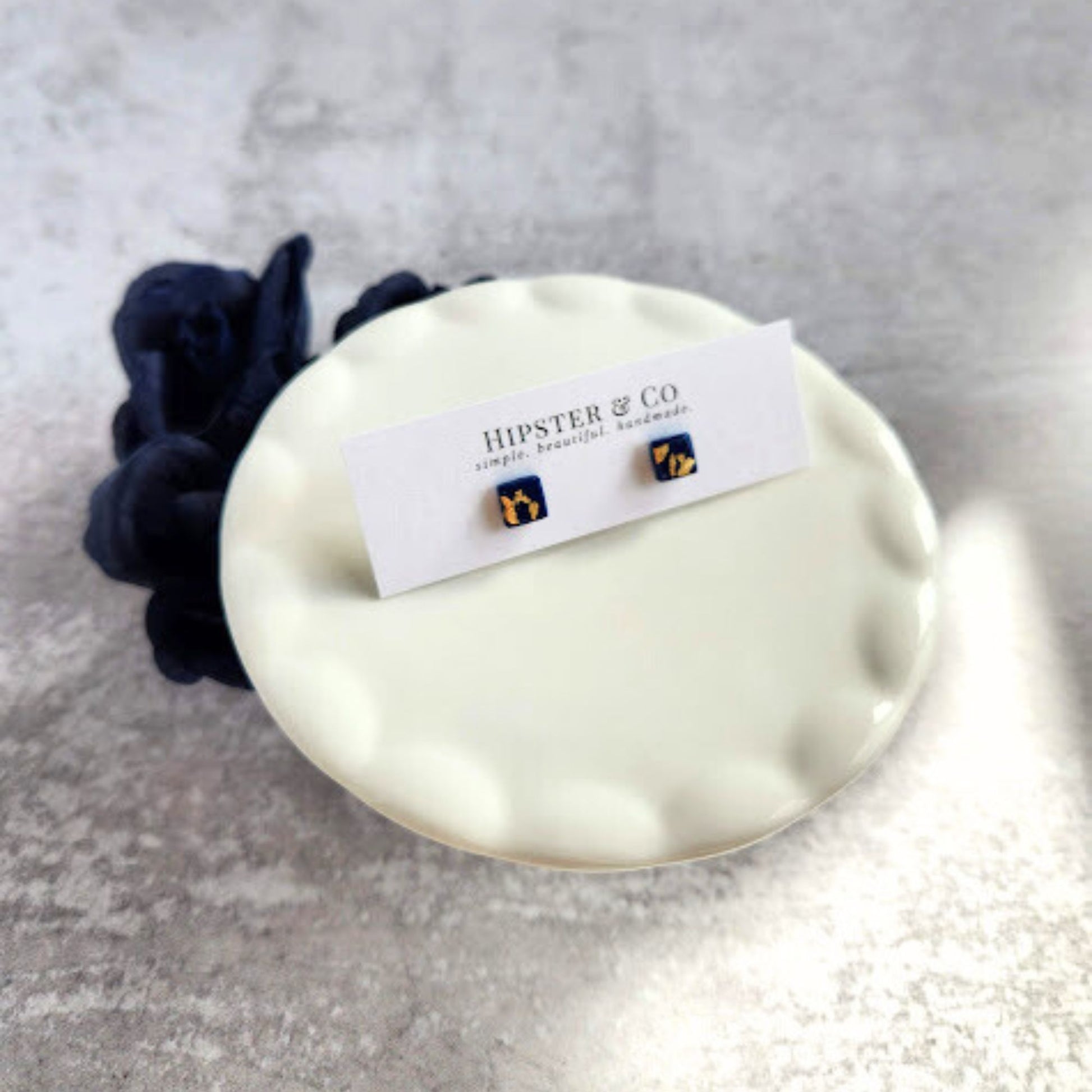These square shaped stud earrings are a lightweight, handmade earring made of polymer clay mixed with imitation gold flakes. These earrings are small and minimal, but anything but plain. The stainless steel earring posts are attached with resin at the base of the posts for a super strong hold.