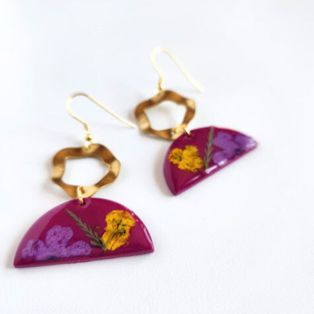 Polymer clay earrings, decorated with dried flowers and coated with a layer of resin. Because of the nature of these earrings, only one of each floral design will be available.