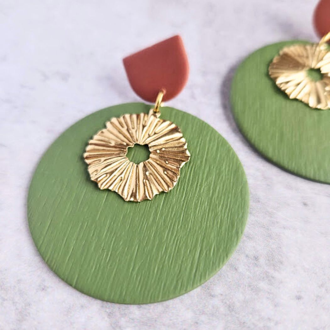 These lightweight earrings make for a fun statement accessory. These geometric earrings are handcrafted in small batches with a beautiful olive green and orange polymer clay. The stainless steel earring posts are glued on and coated with resin at the base of the posts for a super strong hold.