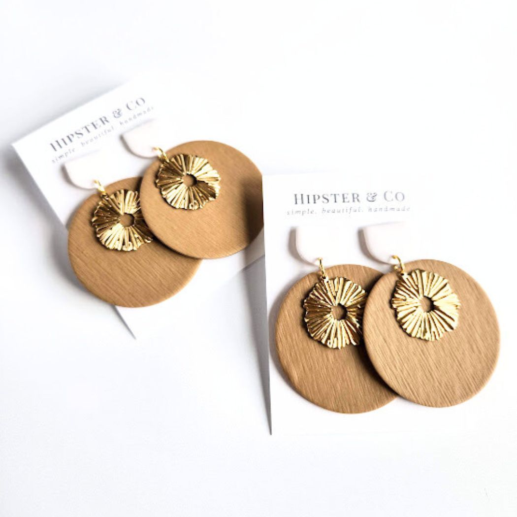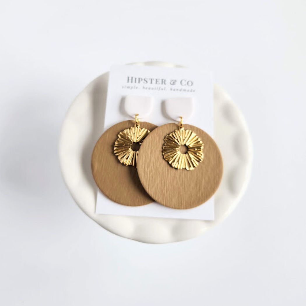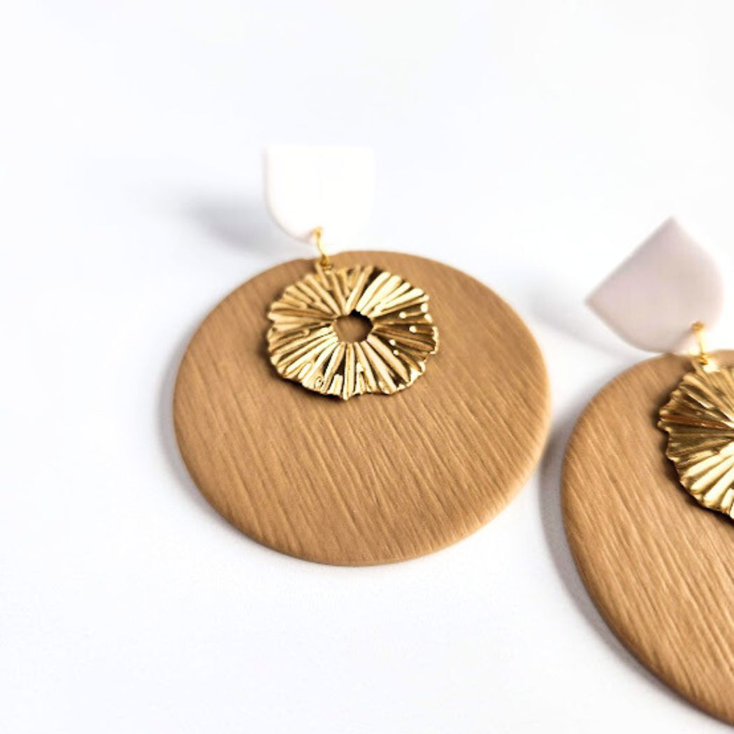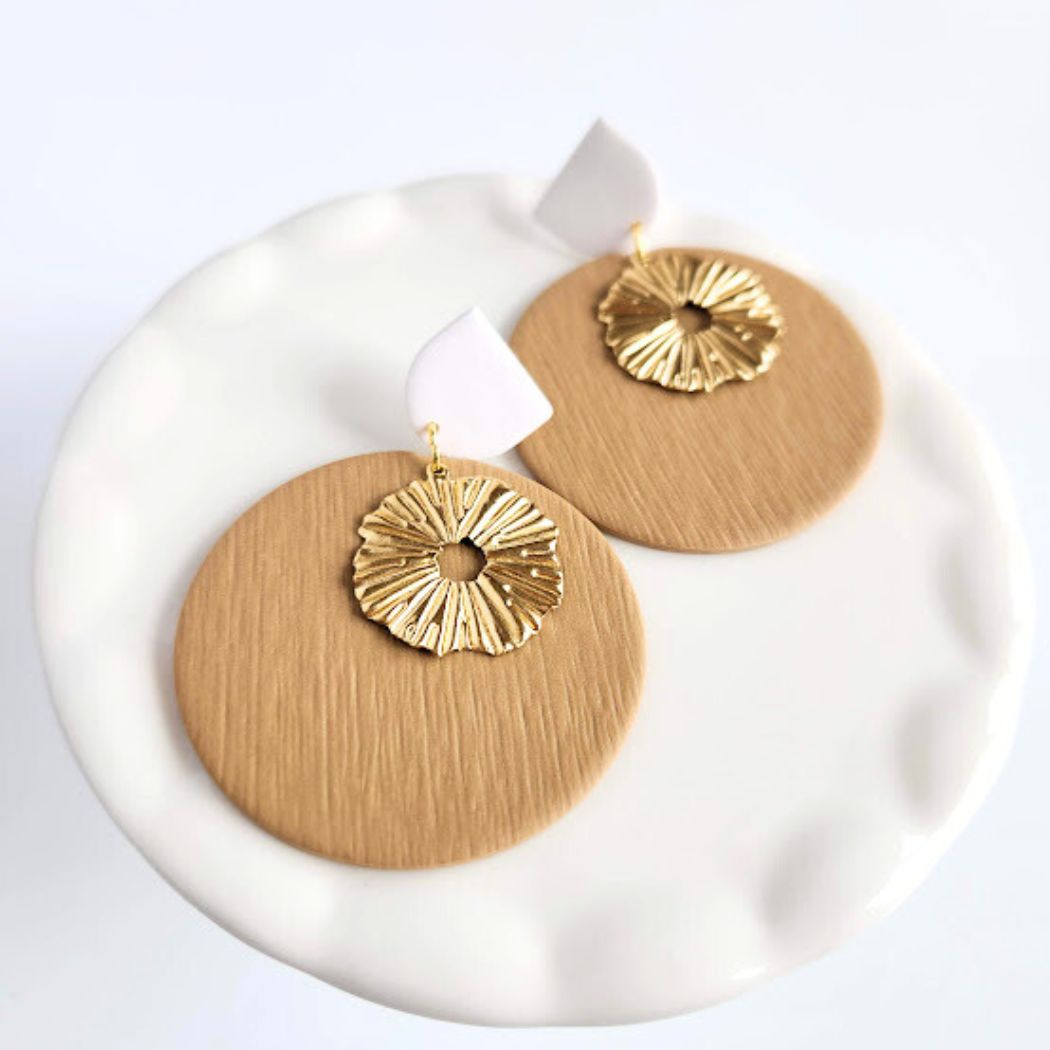 These lightweight earrings make for a fun statement accessory. These geometric earrings are handcrafted in small batches with a beautiful white and light brown polymer clay. The stainless steel earring posts are glued on and coated with resin at the base of the posts for a super strong hold.
