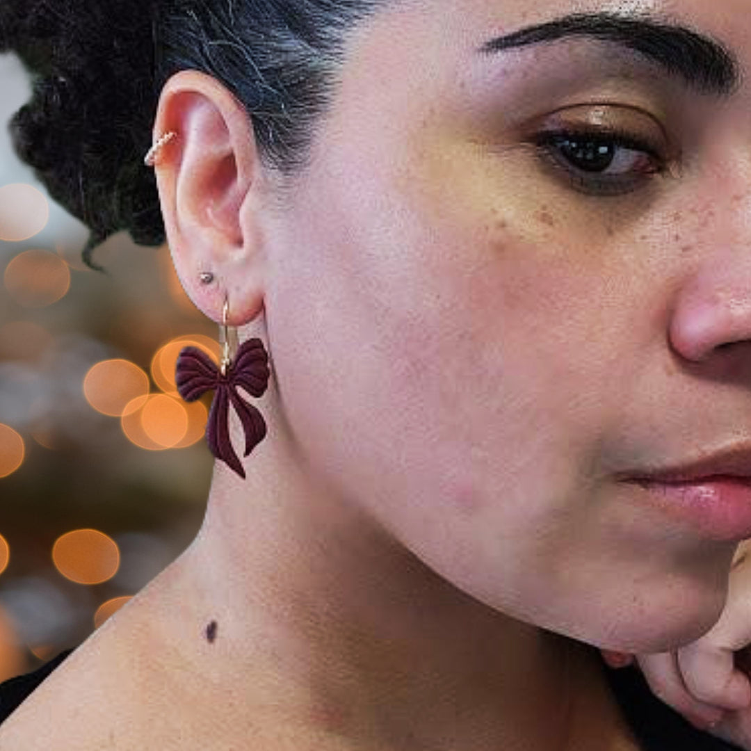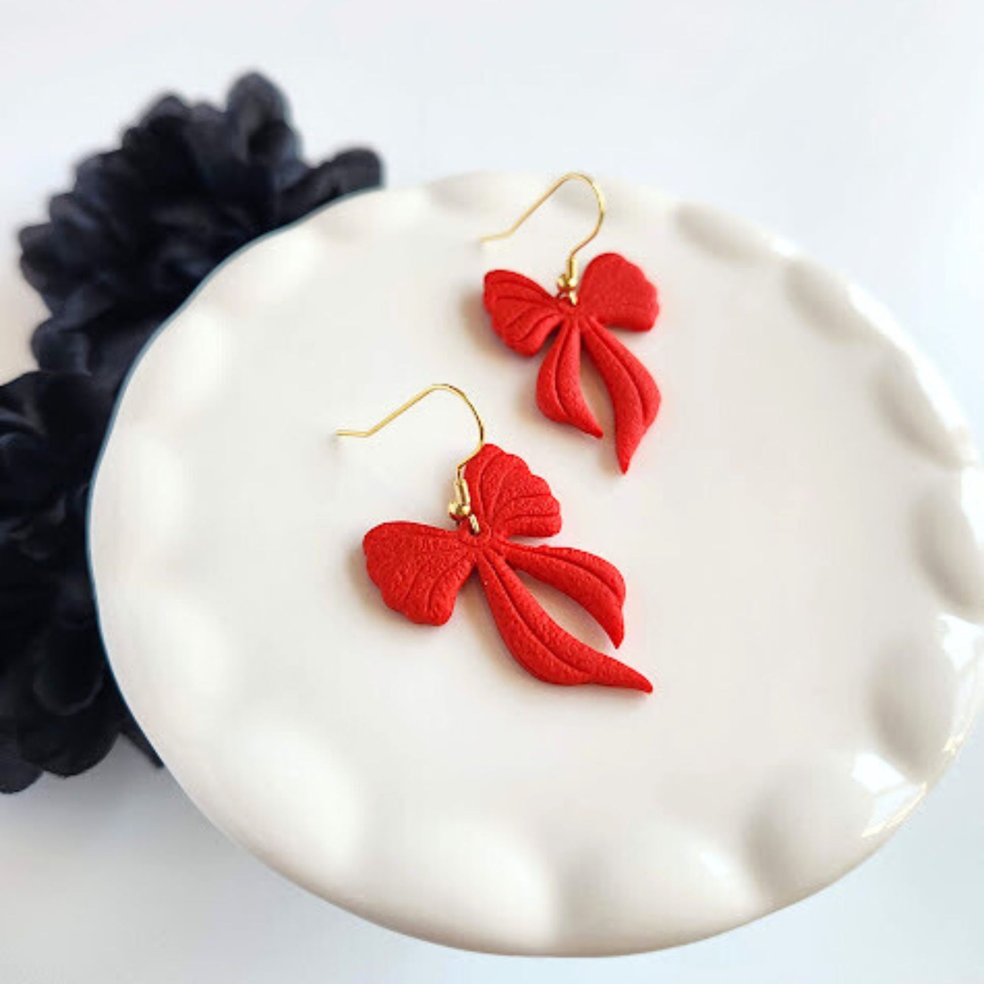 These red bow dangle earrings are super lightweight and a great statement accessory. These earrings are handmade out of a red polymer clay in small batches. These bow are a matte textured finish.