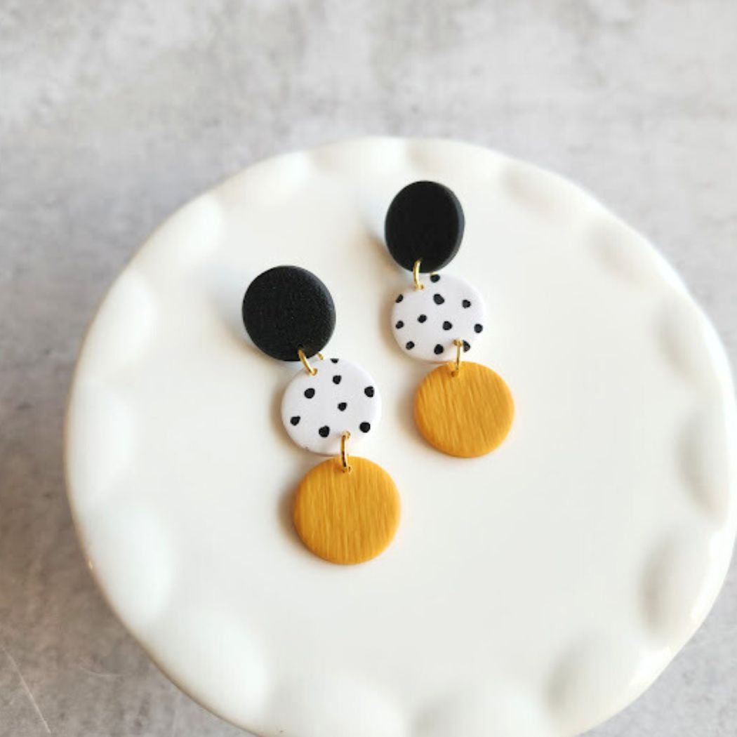 The Pierre earrings are a super simple design, made with circular clay discs. These lightweight earrings are handmade in small batches with a beautiful mix of colors and textures. These specific Pierre earrings are a beautiful color way of mustard, black, and white. The stainless steel earring posts are glued on and coated with resin at the base of the posts for a super strong hold.