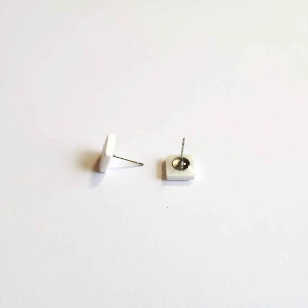 These square shaped stud earrings are a lightweight, handmade earring made of polymer clay mixed with imitation gold flakes. These earrings are small and minimal, but anything but plain. The stainless steel earring posts are attached with resin at the base of the posts for a super strong hold.