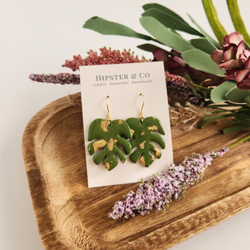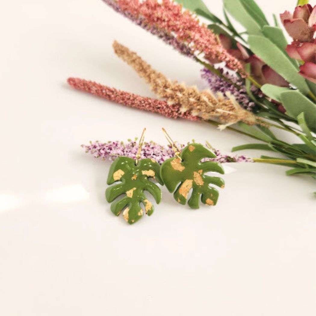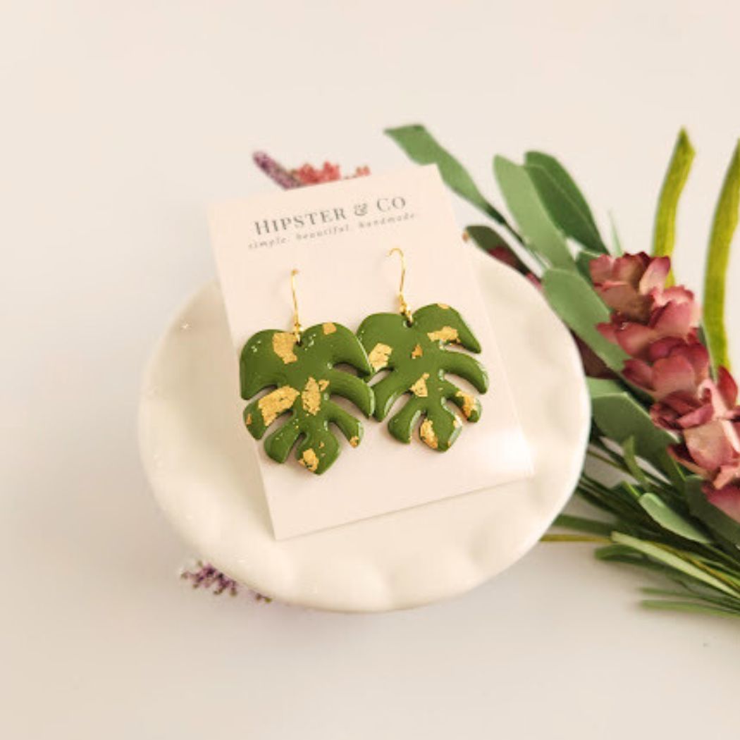These handcrafted monstera leaf earrings are lightweight and a great statement accessory. They are the perfect earrings for plant lovers. These earrings are handmade in small batches out of an olive green colored polymer clay. The fronts of the earrings are coated in resin for a smooth shiny finish. The ear hooks are made of gold-finished stainless steel.