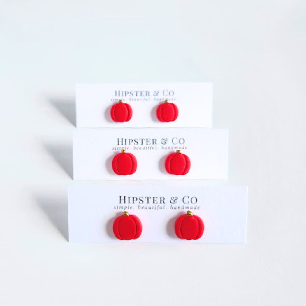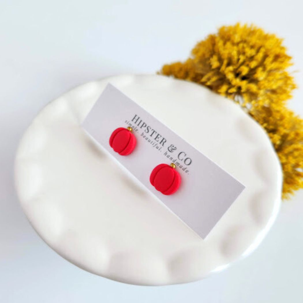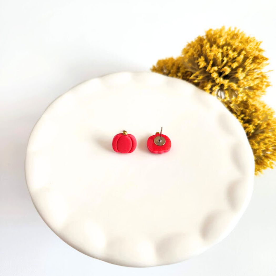 The Raspberry Pumpkin stud earrings are a lightweight, handmade earring made of polymer clay and painted with a gold leaf paint on its stem. These earrings are small and minimal, but anything but plain. They have a matte finish. The stainless steel earring posts are glued on and coated with resin at the base of the posts for a super strong hold.