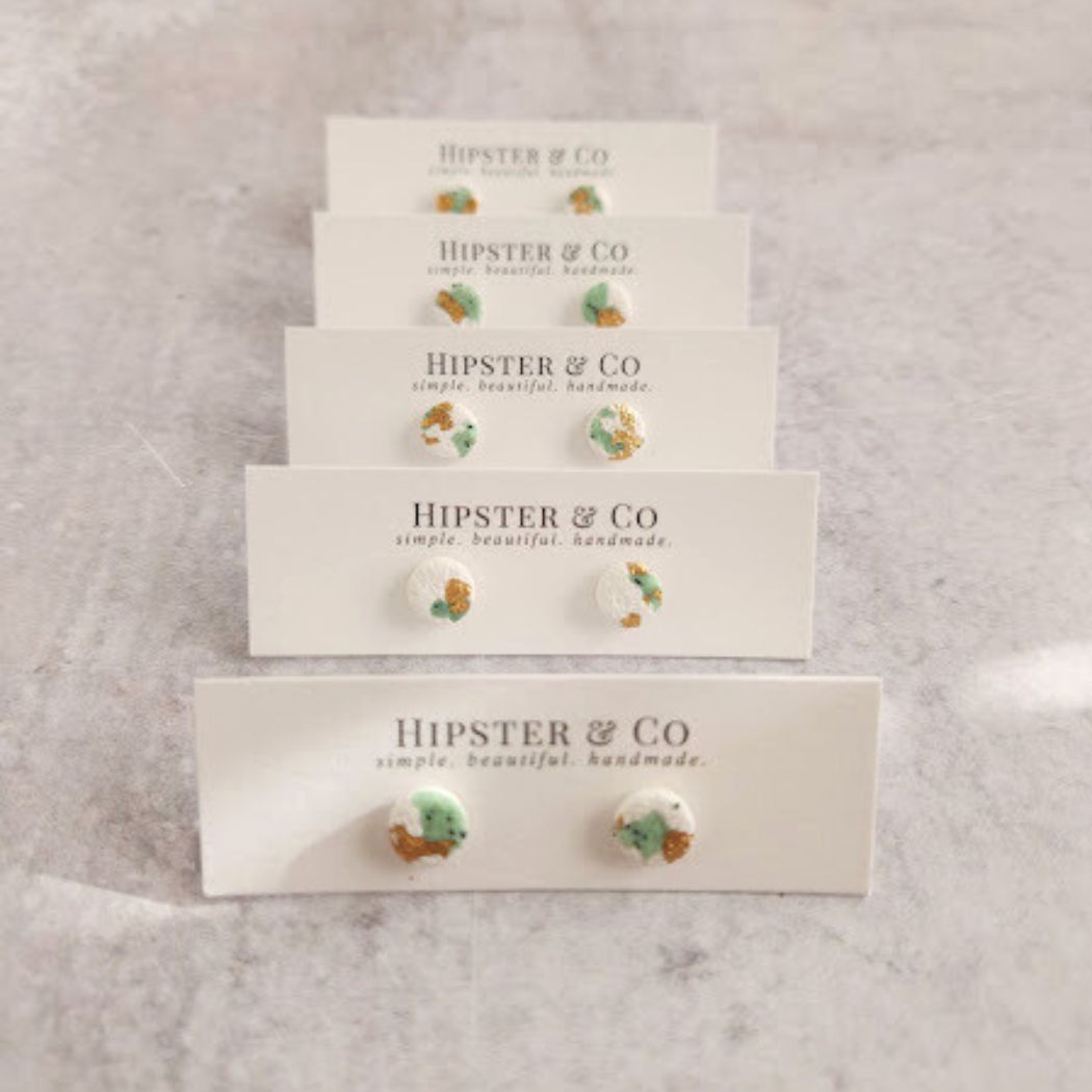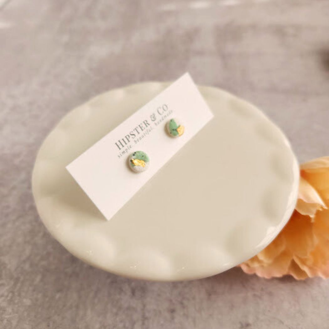 These round stud earrings are a lightweight, handmade earring made of polymer clay mixed with imitation gold flakes. These earrings are small and minimal, but anything but plain. The stainless steel earring posts are attached with resin at the base of the posts for a super strong hold.