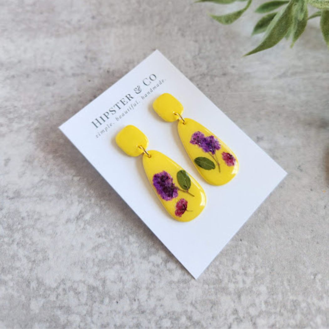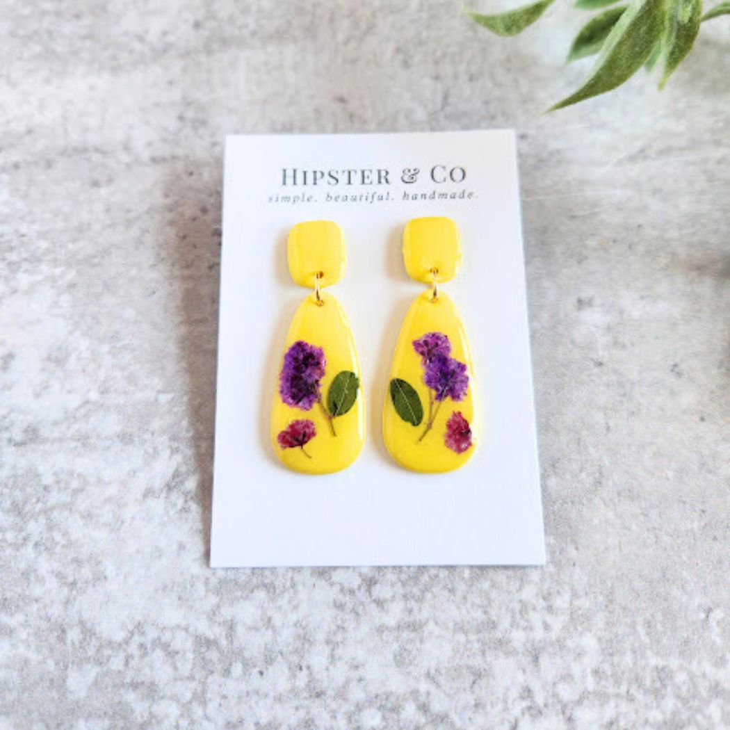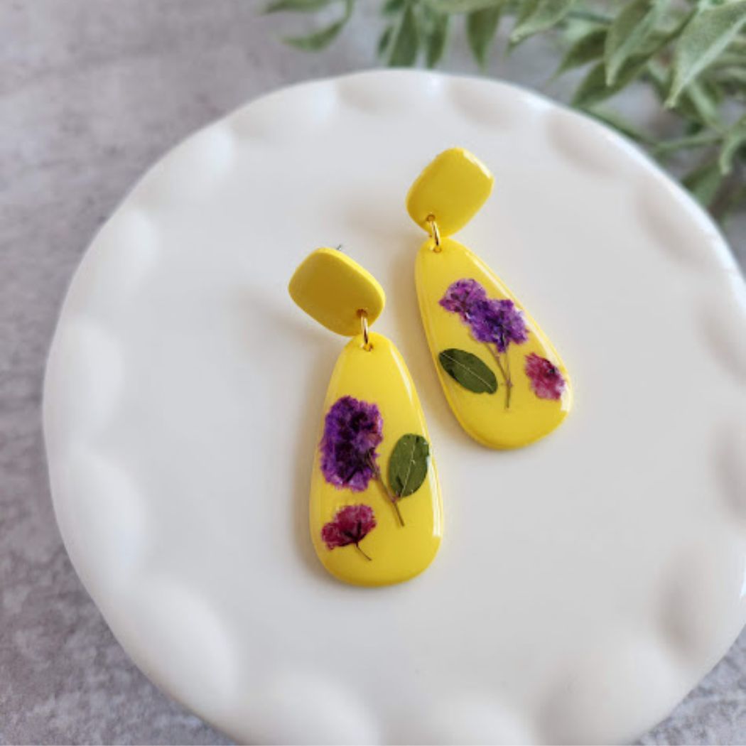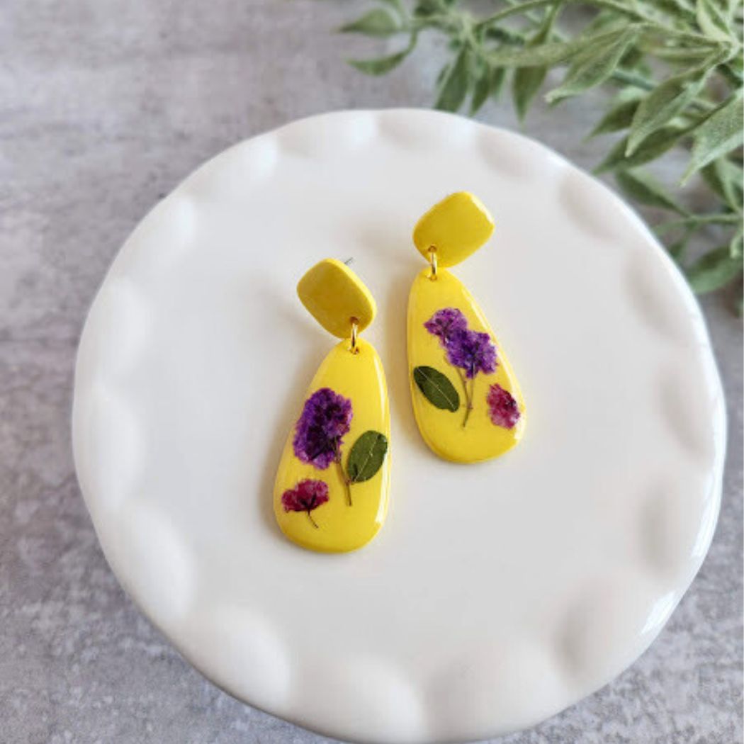 Polymer clay earrings, decorated with dried flowers and coated with a layer of resin. Because of the nature of these earrings, only one of each floral design will be available.