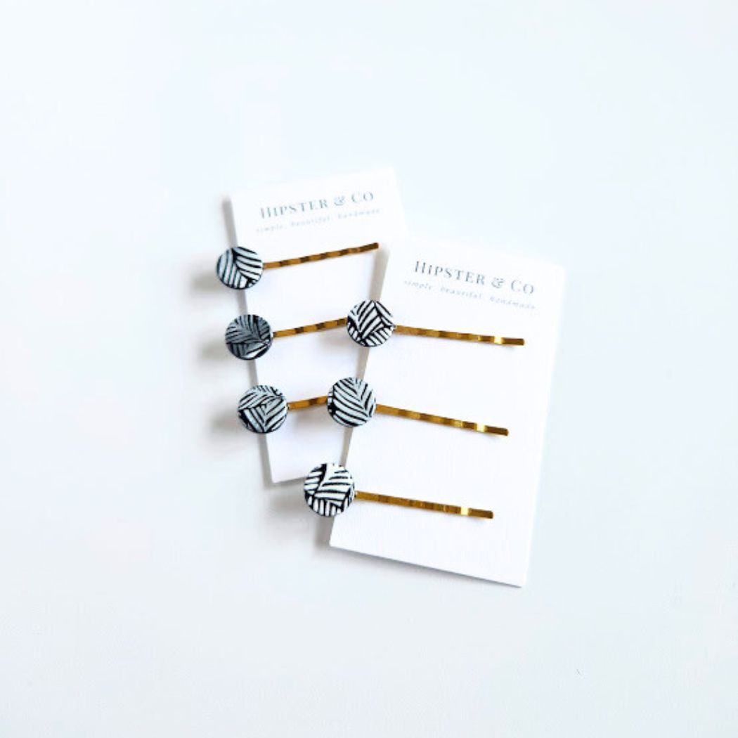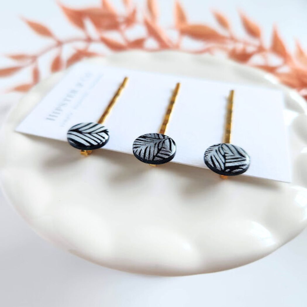 Hair pins are a great way to clip your hair back. Not only are they functional, but they are also decorative hair accessories. These hair pins come in a pack of 3 handmade pins. The circular disks are handmade out of polymer clay and attached to gold colored bobby pins.