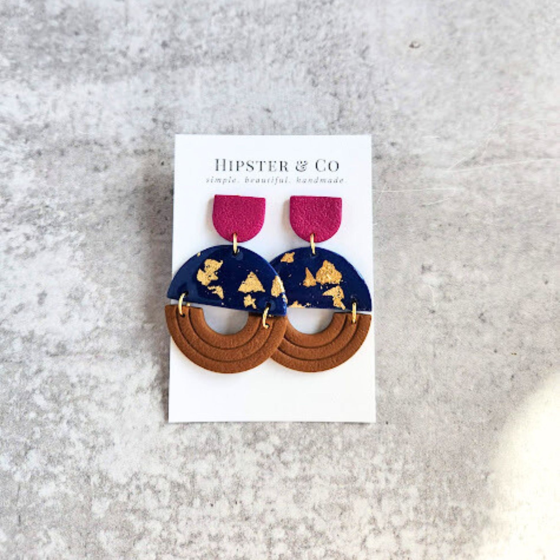 These lightweight earrings make for a fun statement accessory. The Eliana earrings are handmade in small batches with a beautiful mix of colors and textures of polymer clays and imitation gold leaf flakes. The stainless steel earring posts are glued on and coated with resin at the base of the posts for a super strong hold.
