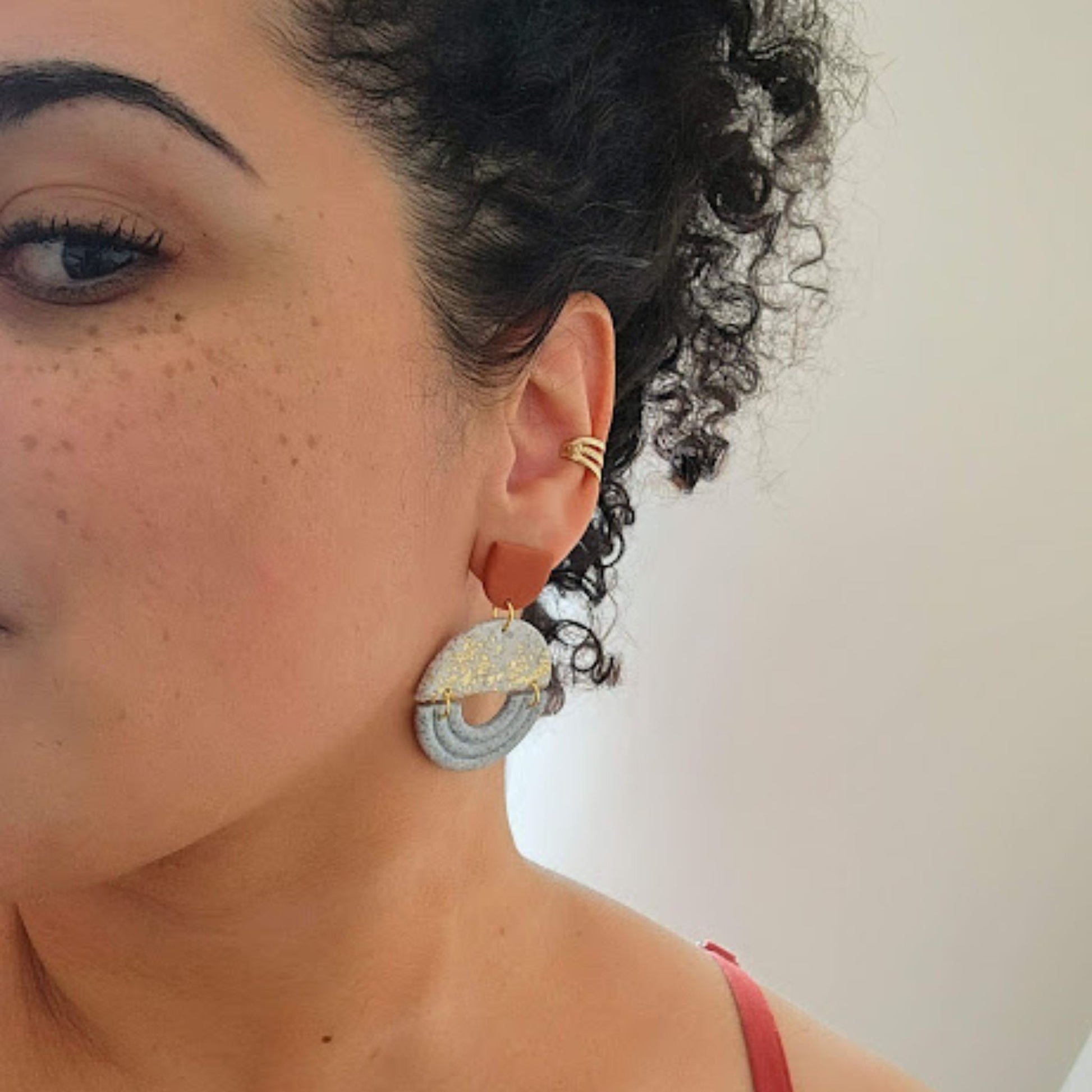 These lightweight earrings make for a fun statement accessory. The Eliana earrings are handmade in small batches with a beautiful mix of colors and textures of polymer clays and imitation gold leaf flakes. The stainless steel earring posts are glued on and coated with resin at the base of the posts for a super strong hold.