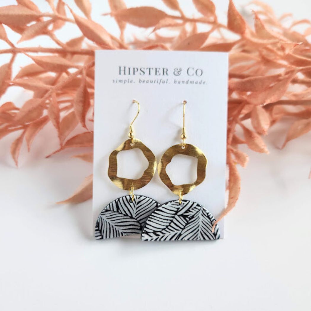 The Isha earrings are super lightweight and a great statement accessory. These earrings are handmade in small batches. The mix of materials makes these earrings super fun. The black clay pieces were screen printed with a beautiful leaf print, and then attached to a uniquely shaped brass pendant. Surgical stainless steel earring hooks are used, making these earring hypoallergenic.